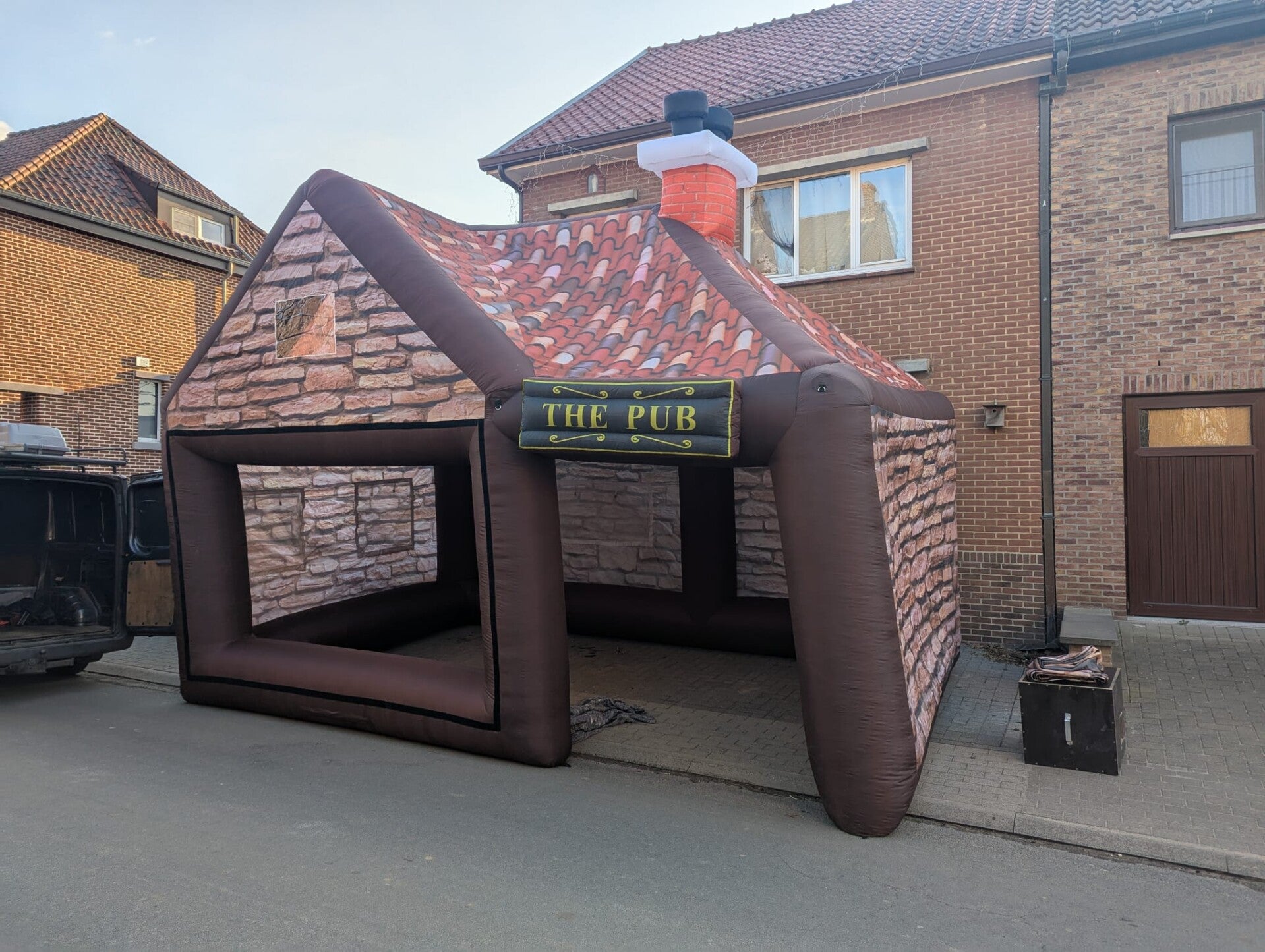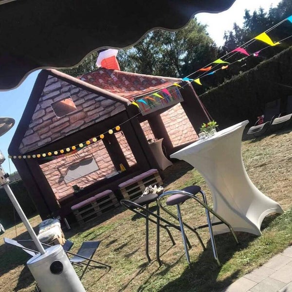 Maak van elk feestje een unieke beleving met dit gezellige opblaasbare huis! De tent heeft de look van een knus stenen huisje met dak en schoorsteen, en biedt ruimte voor tafels, stoelen en sfeervolle decoratie. Perfect voor verjaardagen, tuinfeesten of thema-avonden.